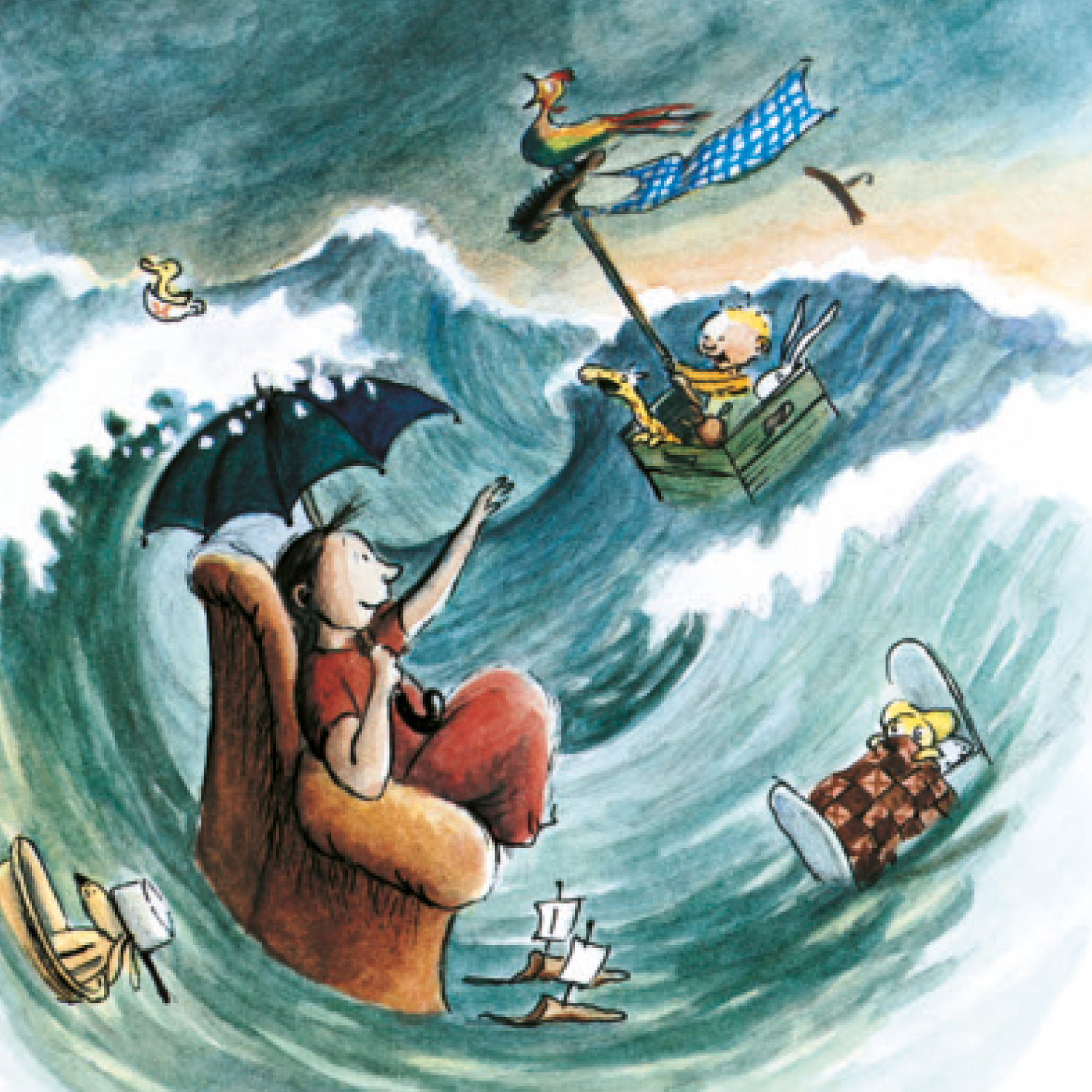 مُبحِرًا في صندوق ألعابه الخشبيّ، وجاعلًا من المكنسة ومن مريلة أمّه صارية، ينطلق الطّفل الشّقيّ بمساعدة أمّه في مغامرة بحريّة خياليّة على أرض البيت المبلولة بالماء. في رحلته تصادفه الأعاصير والأسماك المفترسة، لكنّه يجد مخرجًا من كلّ مأزق بفضل سرعة تفكيره وذكائه.