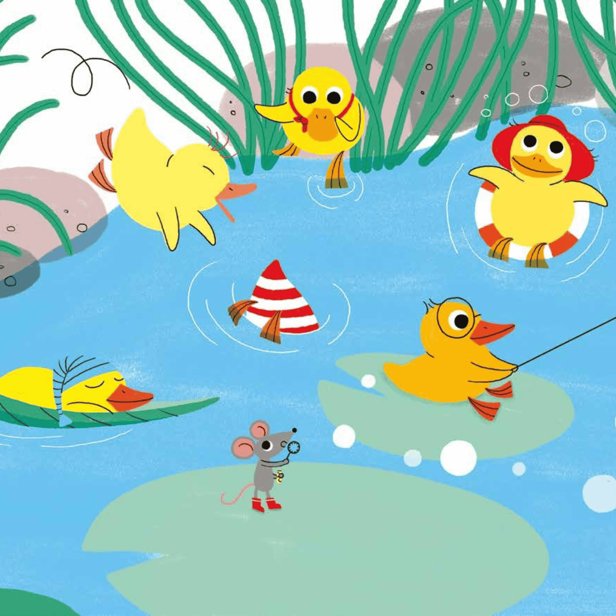 نص ّ مسجوع وحسّي يرافق فراخ البط ّ العشرة في مغامراتها اليوميّة. يدعو الكتاب الطفل لتقبّل التنوّع والاختلاف بين الأصدقاء، وينمّي لدى الطفل مهارات ِ التفكير الكمّي ّ مثل العد ّ وفهم الترتيب، ويعزّز مهارة فهم المسموع.